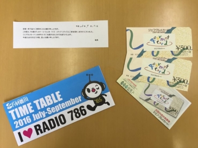 写真は、後日ラジオ局から送られてきた当選特典「グルメカード」です!
